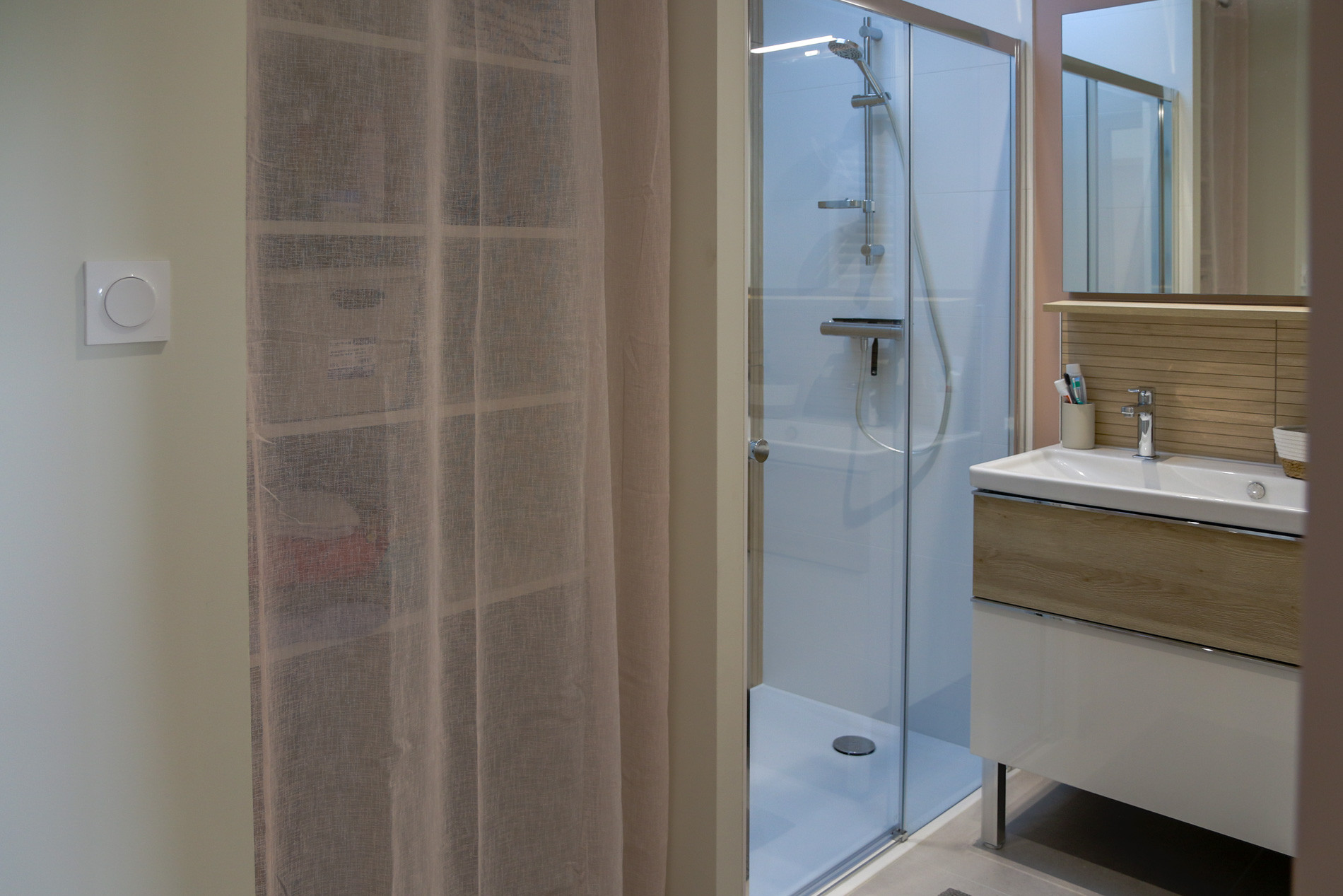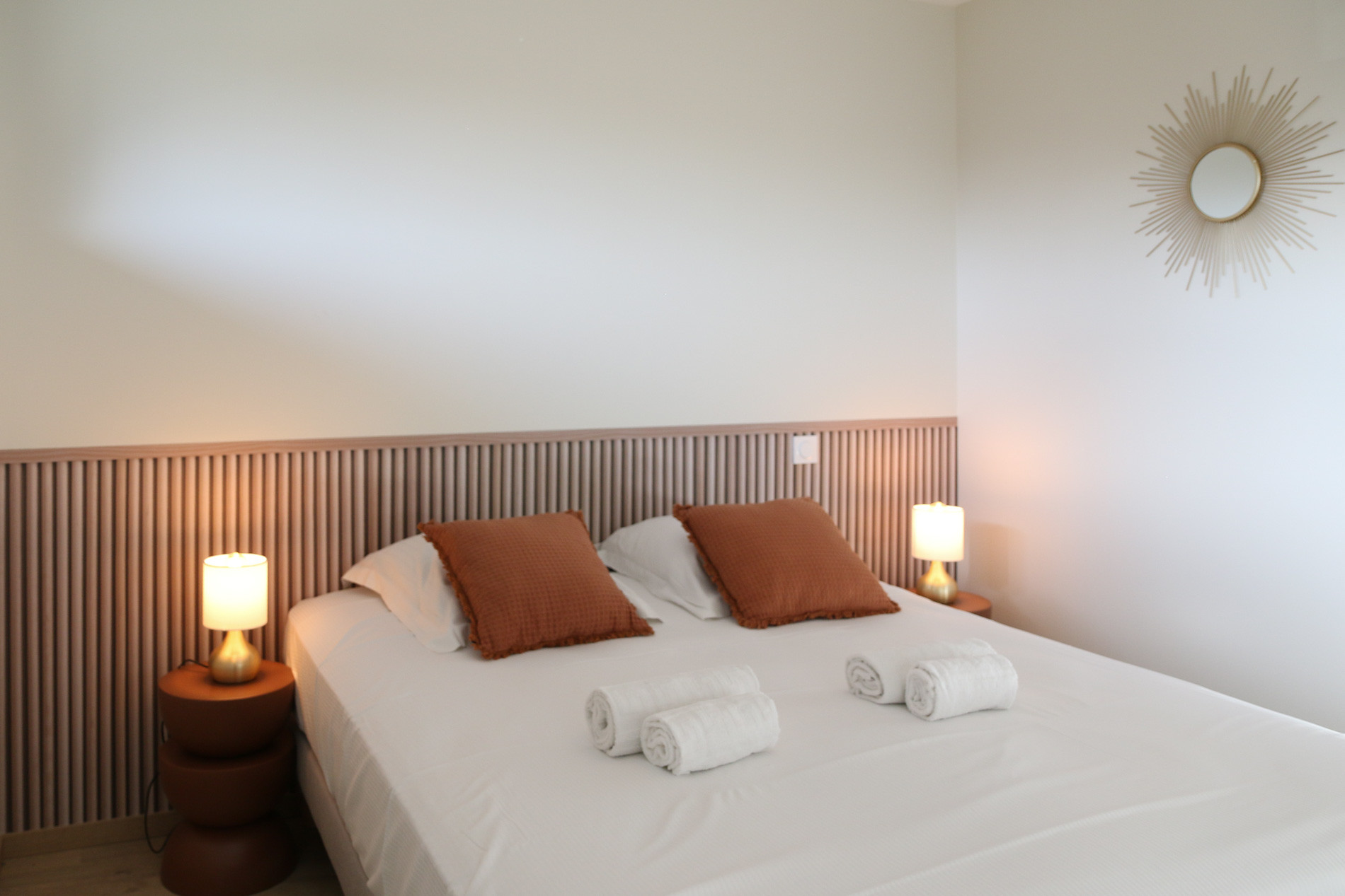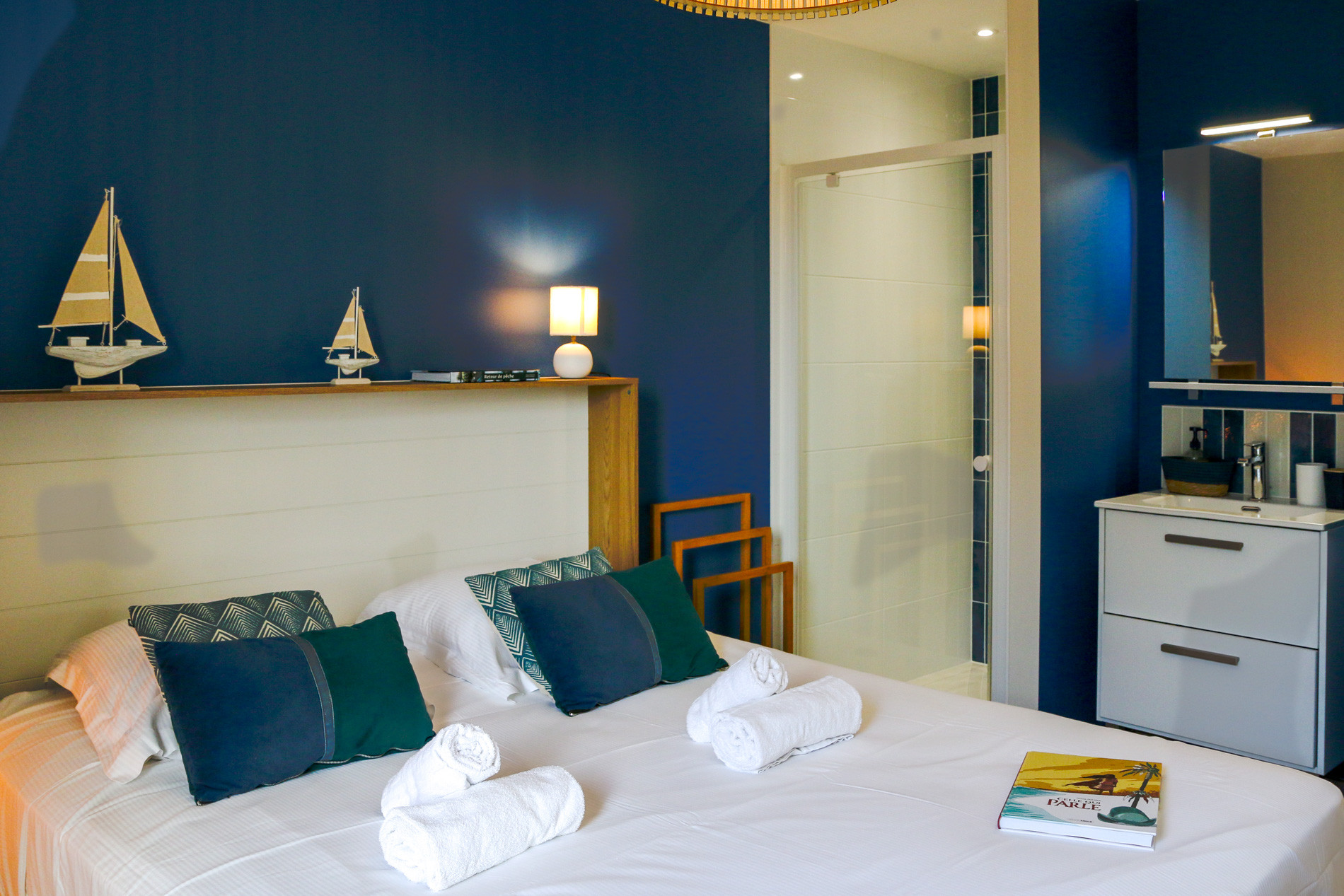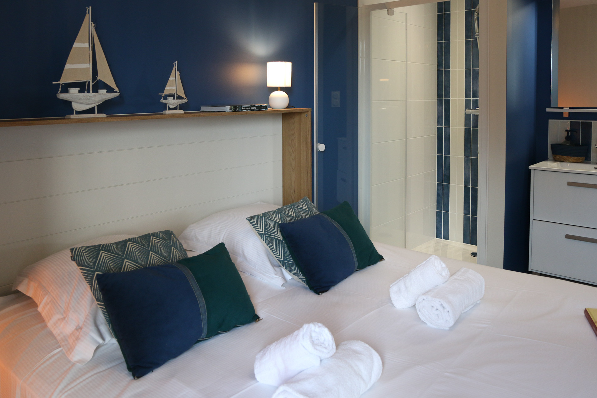 Ker Gavilou comfortably accommodates up to 6 people across three lovely bedrooms located upstairs. Each features a Queen size bed (160x200) and storage. Two of them share a functional shower room, while the third benefits from its own private shower room. Two toilets are available in the house, one on the ground floor and one upstairs.Holiday rental with two large terraces in Brittany