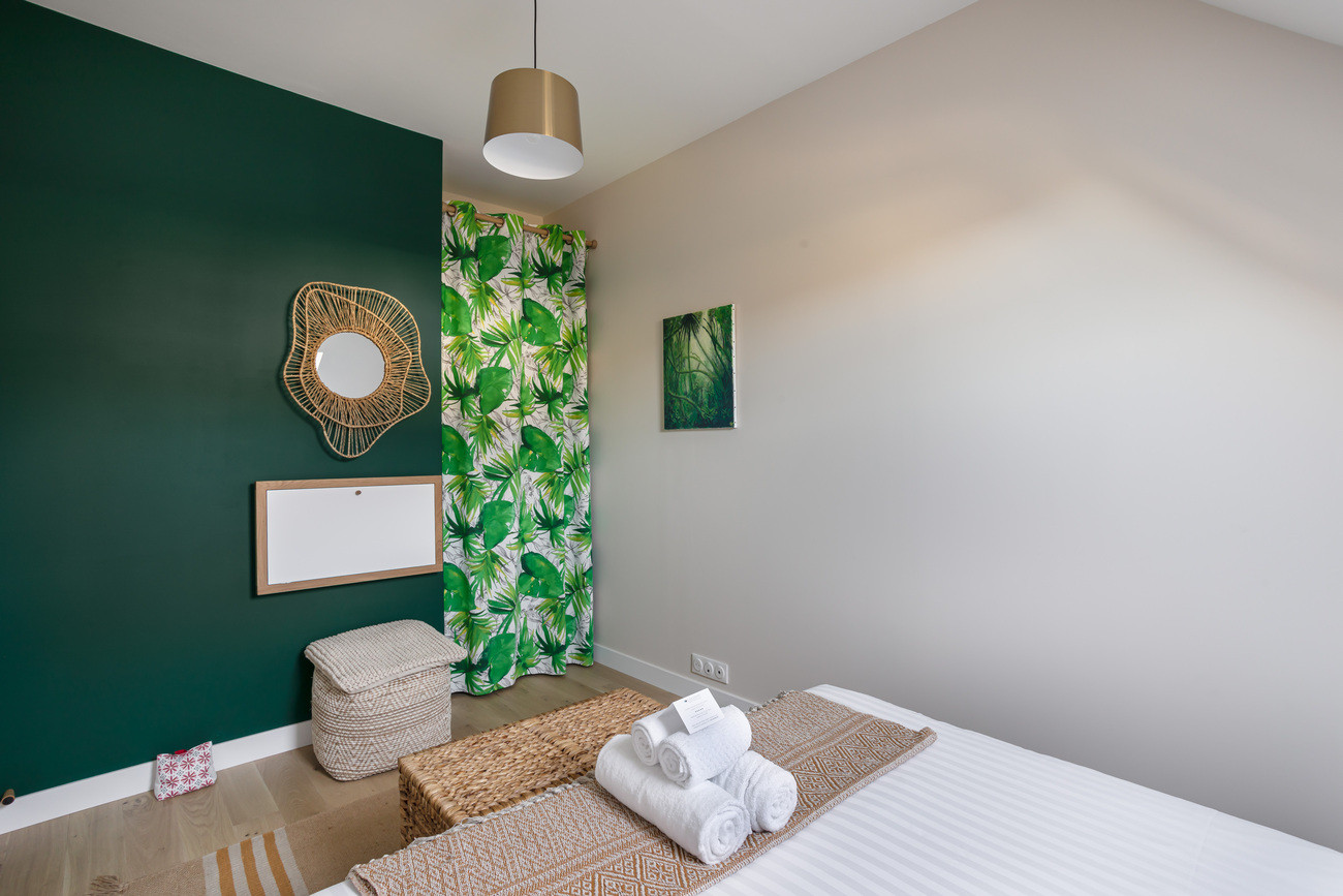 Accommodating up to 4 guests, Les Flots Bleus offers two bedrooms located upstairs. The first bedroom features two bunk beds 90x190. The other bedroom offers a Queen-size bed 160x200. They share a bathroom with bathtub and single washbasin. The house also includes two separate toilets, one on the ground floor and the other upstairs.Holiday rental with terrace and full amenities close to the sea
