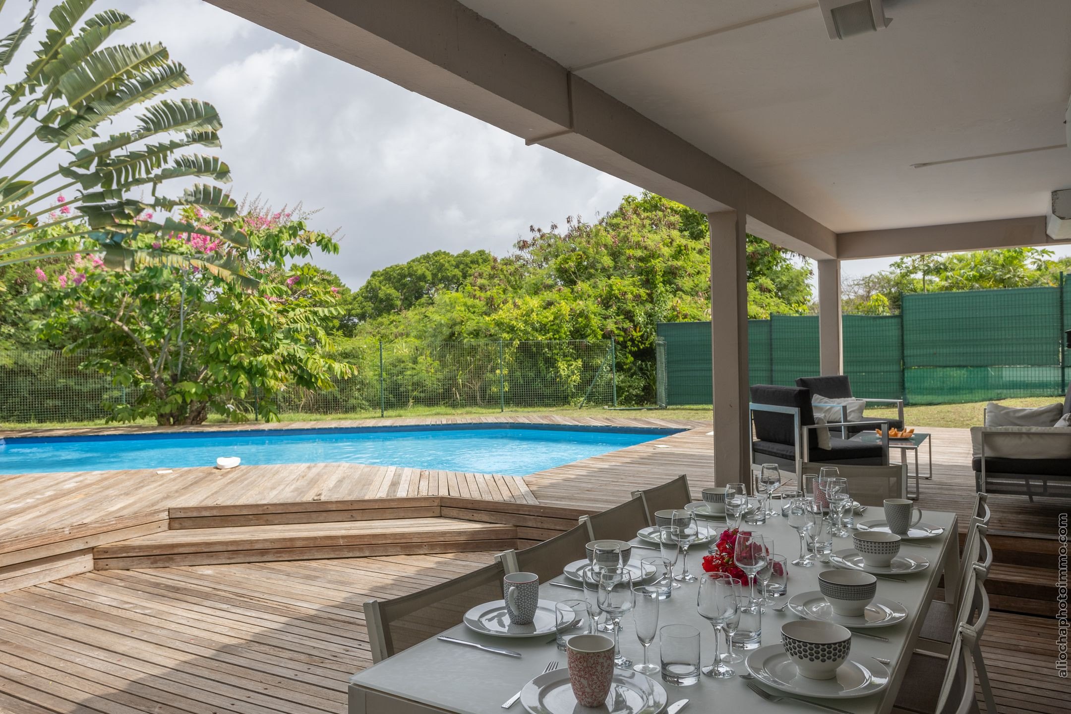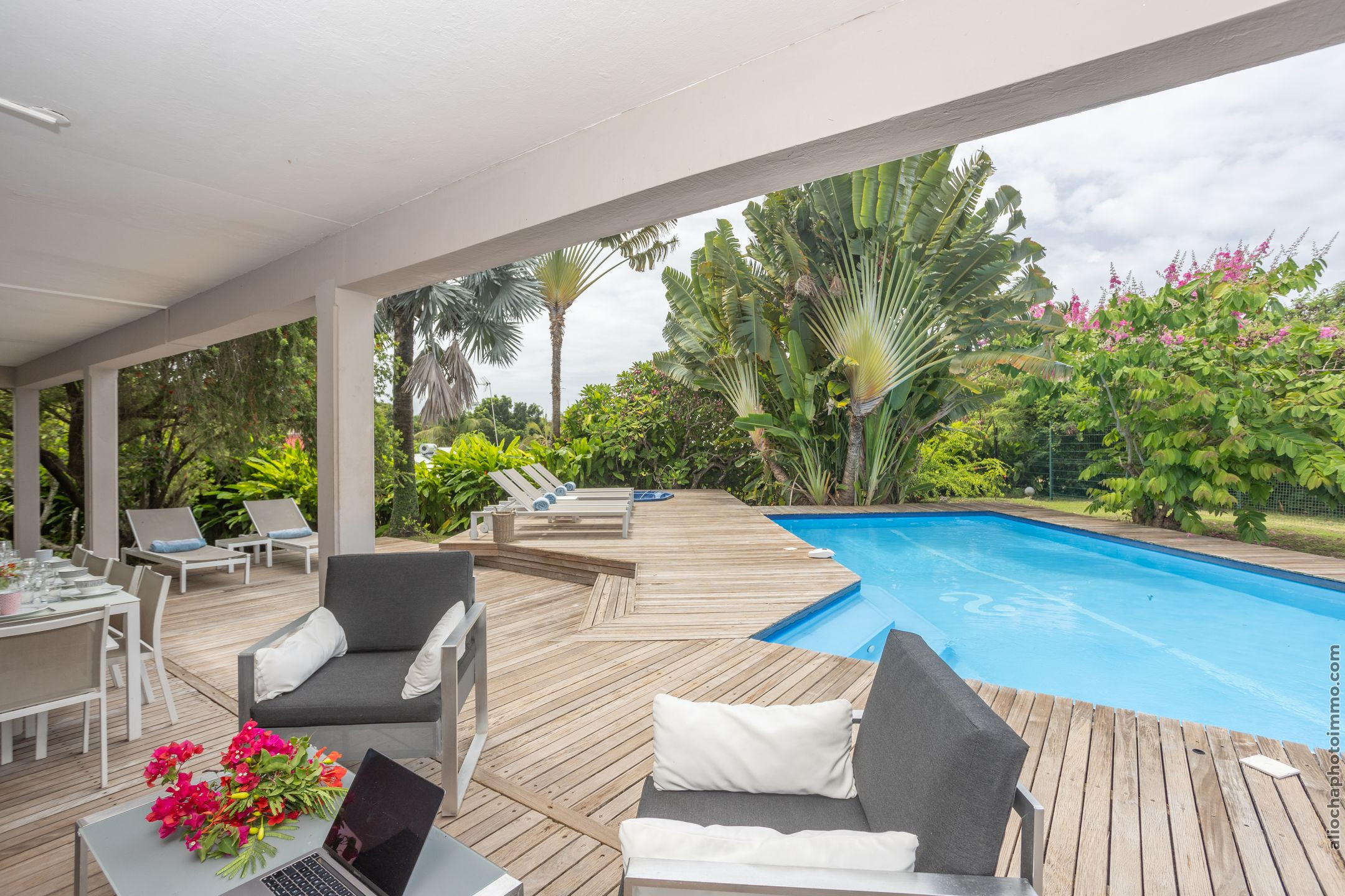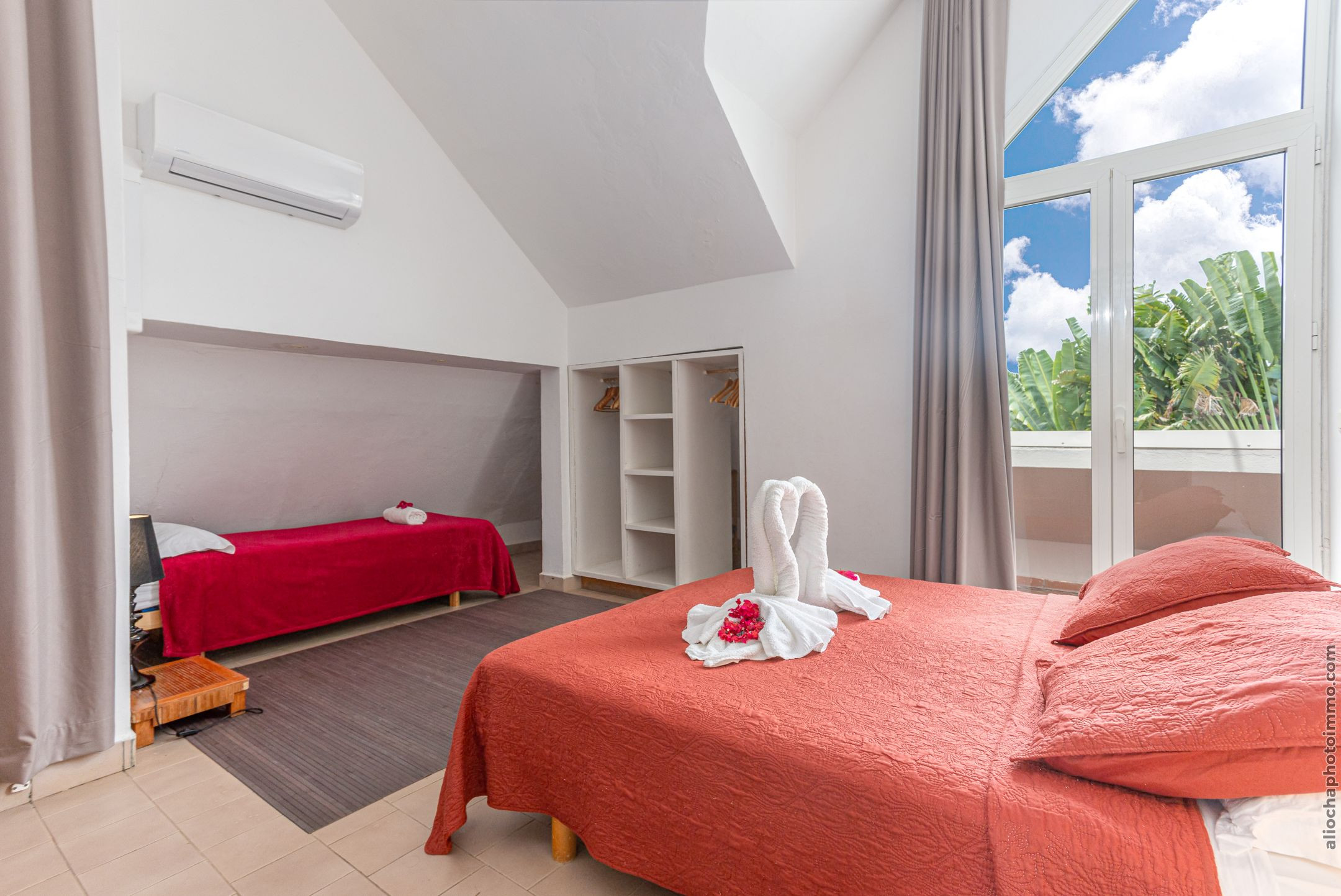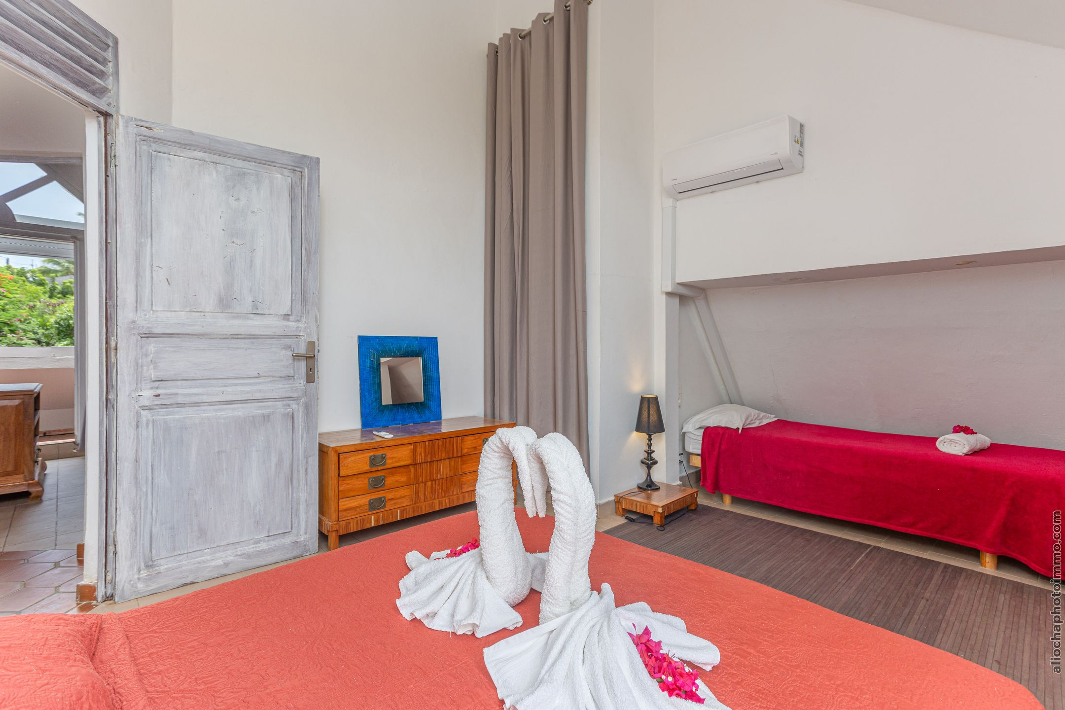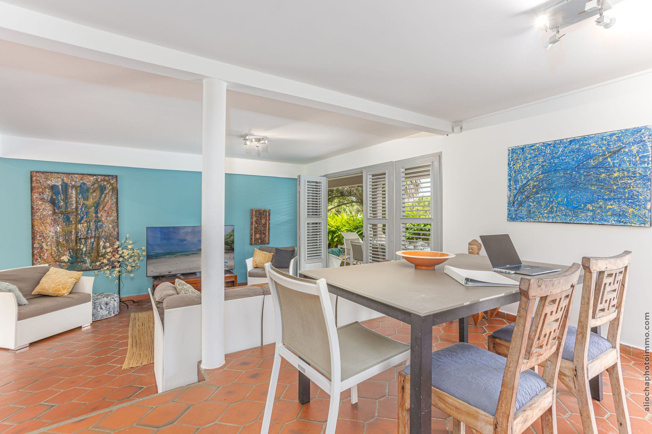 The expansive contemporary living room of Villa Karukera opens onto a fully equipped open-plan kitchen, creating a bright and functional living space that extends onto the terrace—perfect for family meals, dinners with friends, or simply enjoying the view of the pool. Two dining tables are available, inside in the dining area or on the terrace, according to your preference. The villa features four air-conditioned bedrooms, three bathrooms, and a guest WC, accommodating up to 11 guests. The layout ensures private space for everyone: on the ground floor, a bedroom with pool and terrace views offers a Queen-size bed, a single bed, and a private bathroom with WC. Upstairs, two bedrooms with a Queen-size bed and a single bed share a bathroom with WC, while a fourth bedroom features three single beds and its own bathroom with WC. This arrangement is designed to provide comfort, serenity, and privacy throughout your stay.Your holiday home with pool, jacuzzi, and tropical garden by the sea
