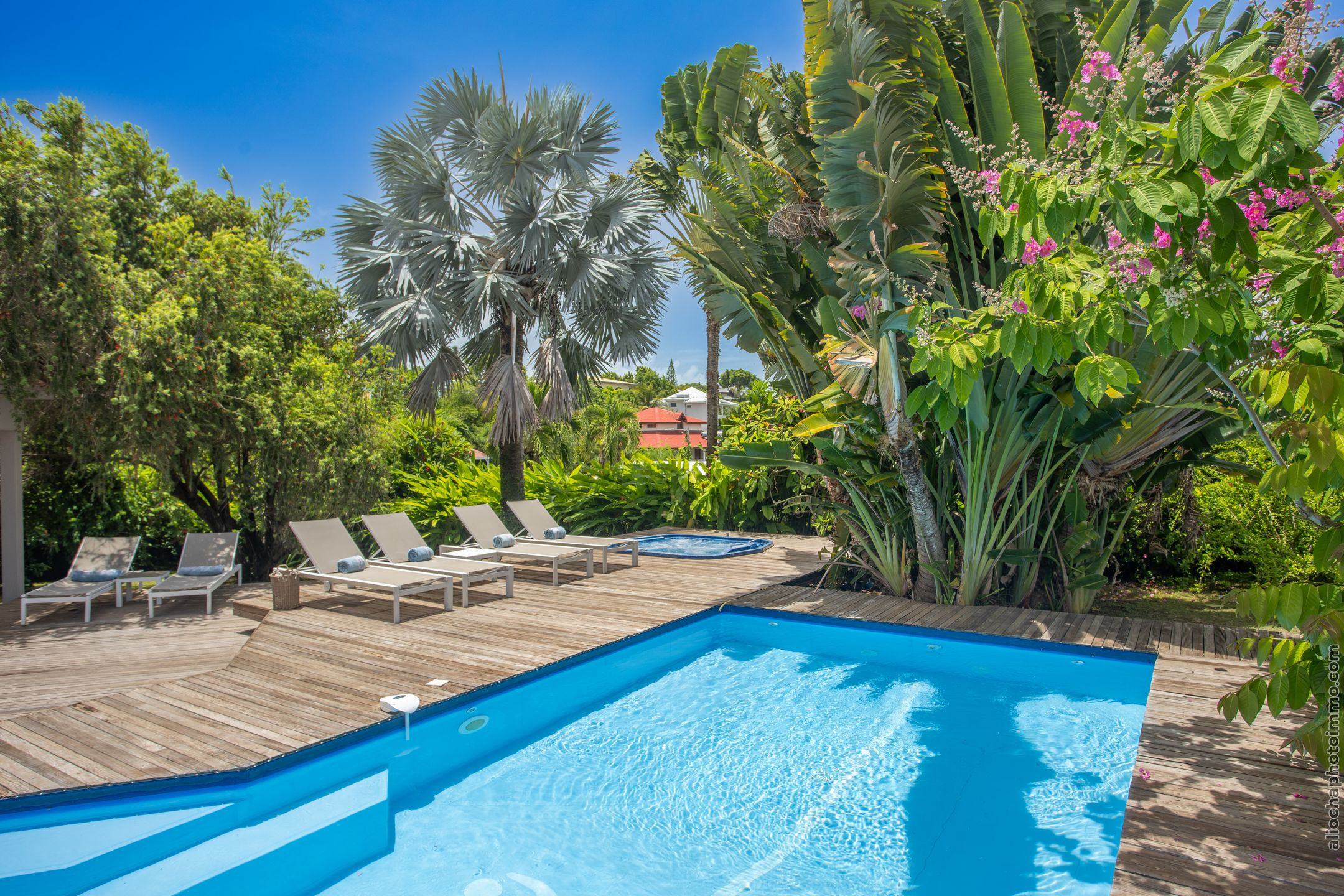 Outside, Villa Karukera offers a true tropical retreat with a uniquely shaped 9.5 x 4 m saltwater pool and a jacuzzi nestled around the deck, all surrounded by a lush garden with traveler’s trees, palm trees, and bougainvillea. Sun loungers, an outdoor seating area, and a shaded table provide the perfect setting to relax, enjoy drinks and meals al fresco, or simply admire the scenery, making this space a true seaside haven.Just steps from Anse à Jacques beach, Villa Karukera is the perfect address for a vacation combining swimming, relaxation, and memorable moments with family or friends.