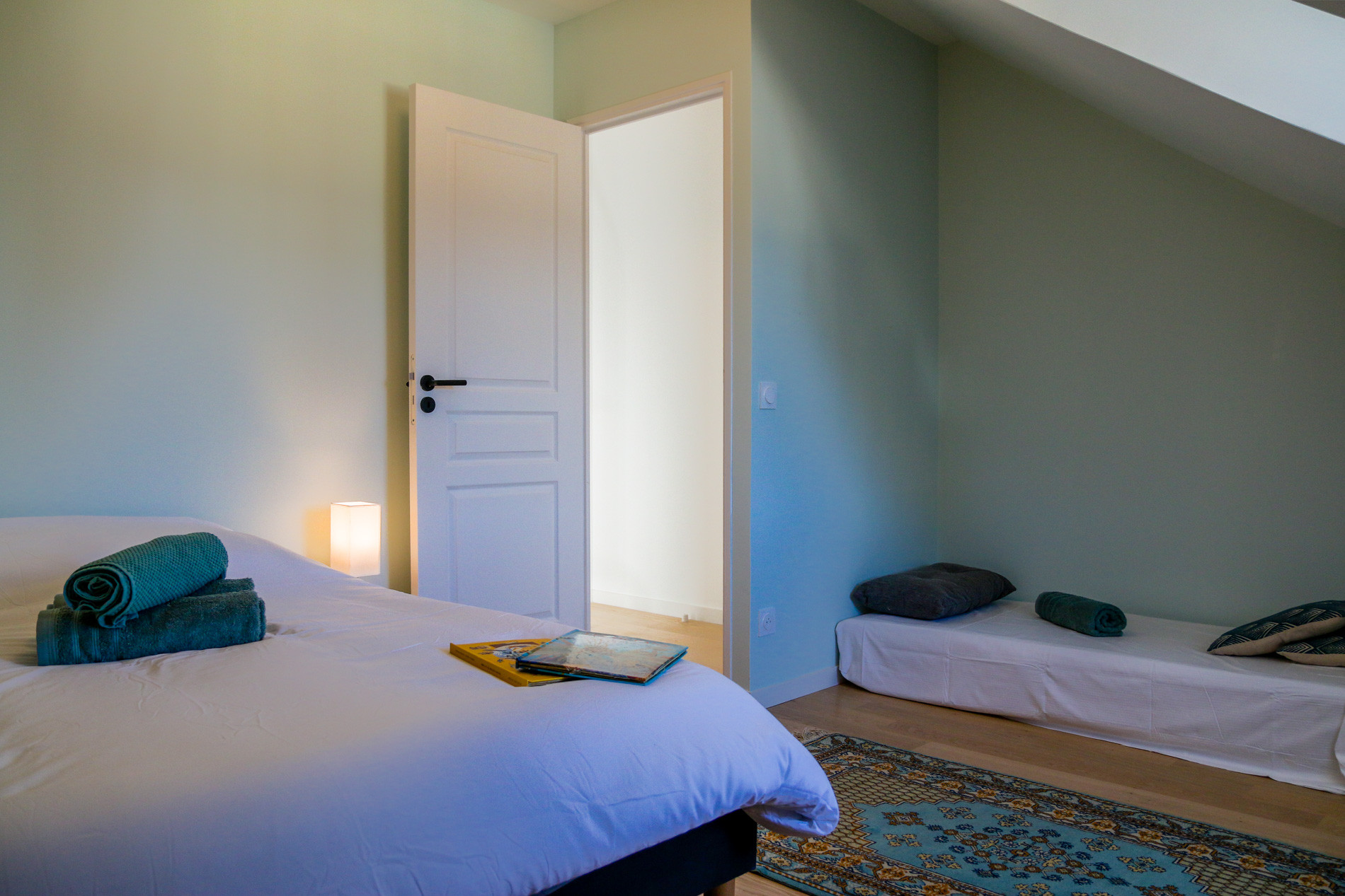 L’appartement dispose de deux chambres situées à l’étage : une chambre peut accueillir jusqu’à 3 personnes grâce à son lit double (140x190) et sa chauffeuse, idéale pour un enfant (90x190). Une autre chambre propose un lit double (140x190). Ces chambres se partagent une salle de bain avec une douche et des toilettes intégrées. Une autre toilette se situe au rez-de-chausséeIdéalement situé à Cancale, à proximité des commerces, restaurants et du sentier côtier, l’appartement Bel Étage Cancalais constitue une location de choix pour profiter pleinement de votre séjour en Bretagne, entre détente et découvertes.