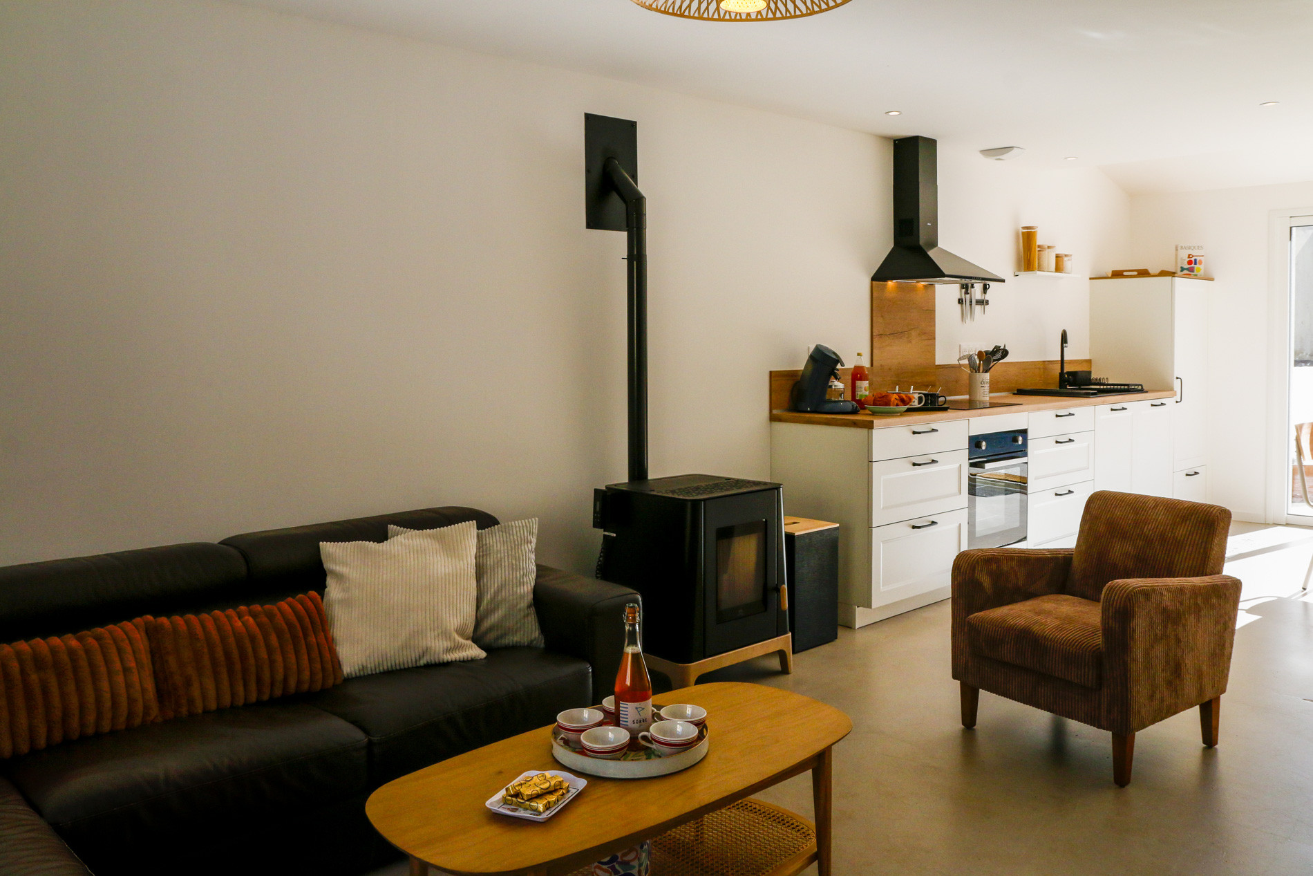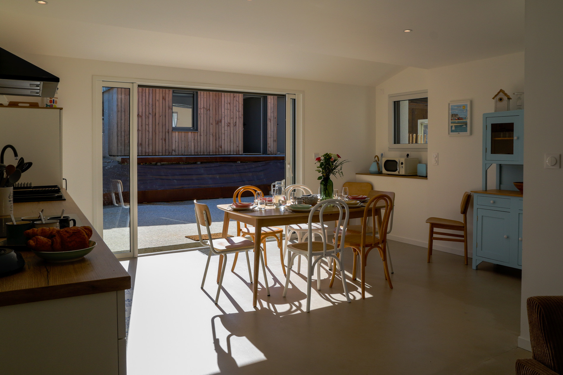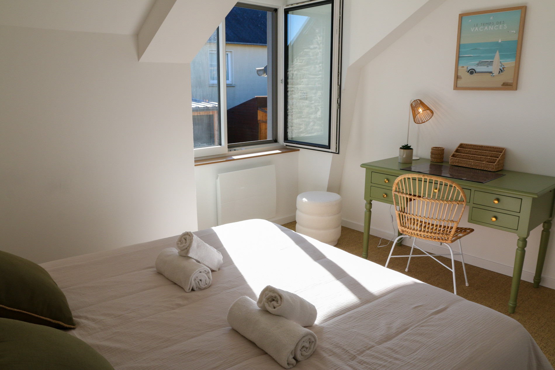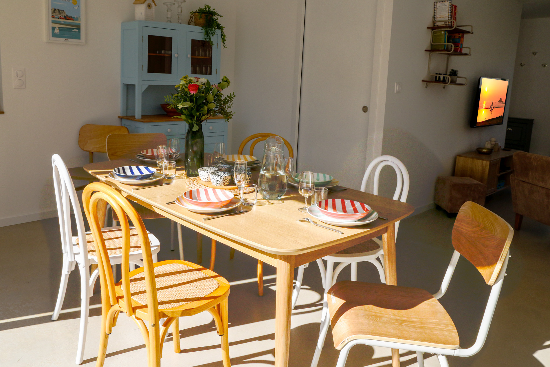 Pensée pour accueillir jusqu’à 6 adultes et 2 enfants (moins de 12 ans), Azur Cancale séduit par ses espaces chaleureux et fonctionnels. Au rez-de-chaussée, vous découvrirez une agréable pièce de vie comprenant un salon confortable équipé d’un poêle à granulés (utilisable d’octobre à fin mars), parfait pour les séjours hors saison, ainsi qu’un espace repas pouvant réunir jusqu’à 8 convives autour de la table. La cuisine ouverte est fonctionnelle et entièrement équipée.Location en Bretagne avec trois chambres dans la maison principale et une dépendance