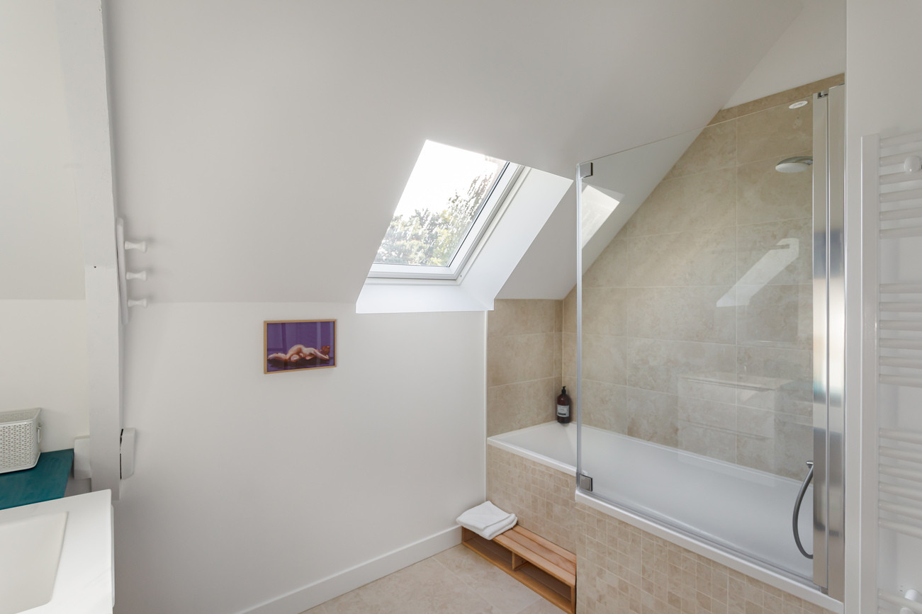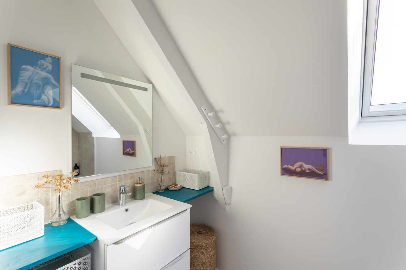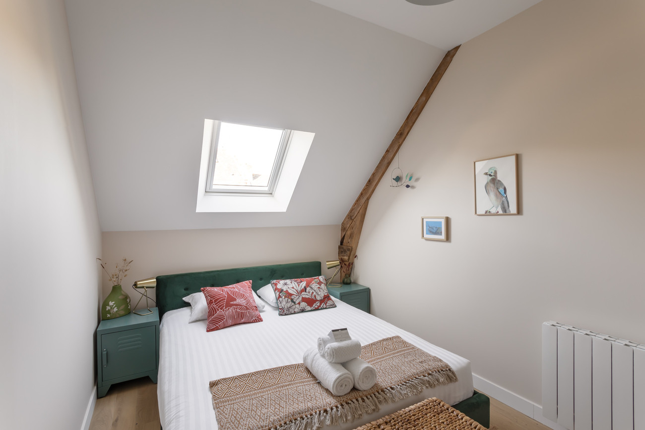 Dès l’entrée, vous serez séduits par sa belle pièce de vie de 50 m². Cet espace généreux réunit un salon (canapé convertible qui peut servir de lit double à la demande), un coin repas chaleureux et une cuisine ouverte entièrement équipée et fonctionnelle. Un accès direct depuis la cuisine vers la terrasse permet de profiter facilement des repas en extérieur et des longues soirées d’été.Location en Bretagne avec deux chambres confortables à l’étage