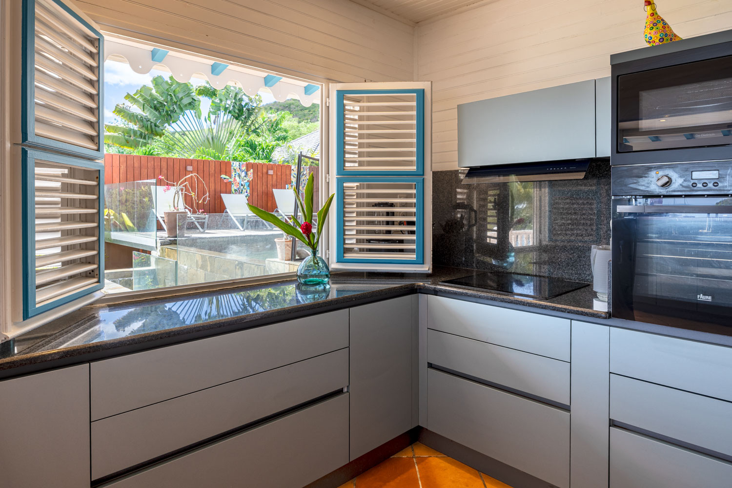 La cuisine, moderne et entièrement équipée, permet de cuisiner face à la mer dans une atmosphère conviviale et apaisante.