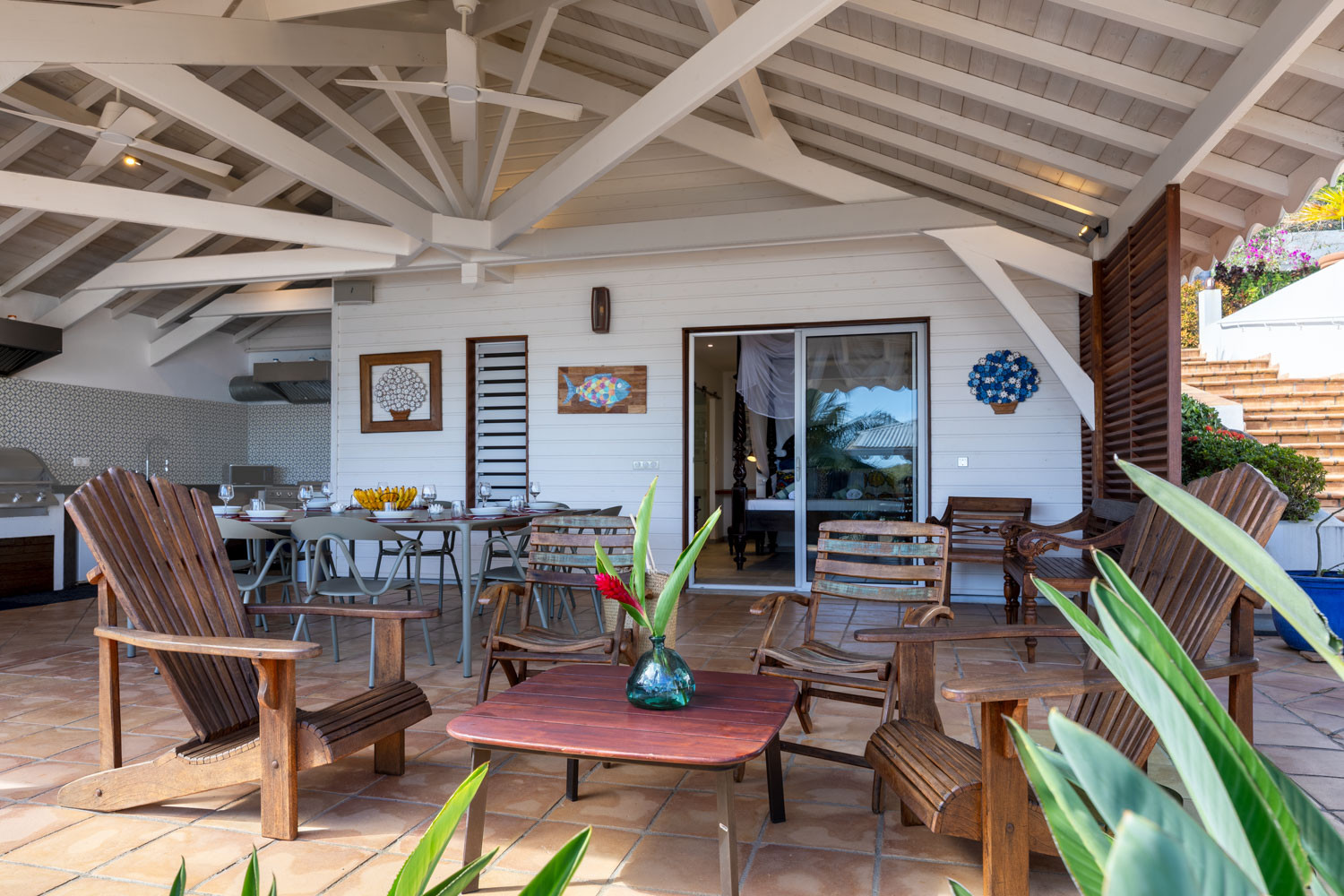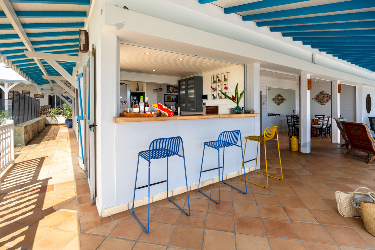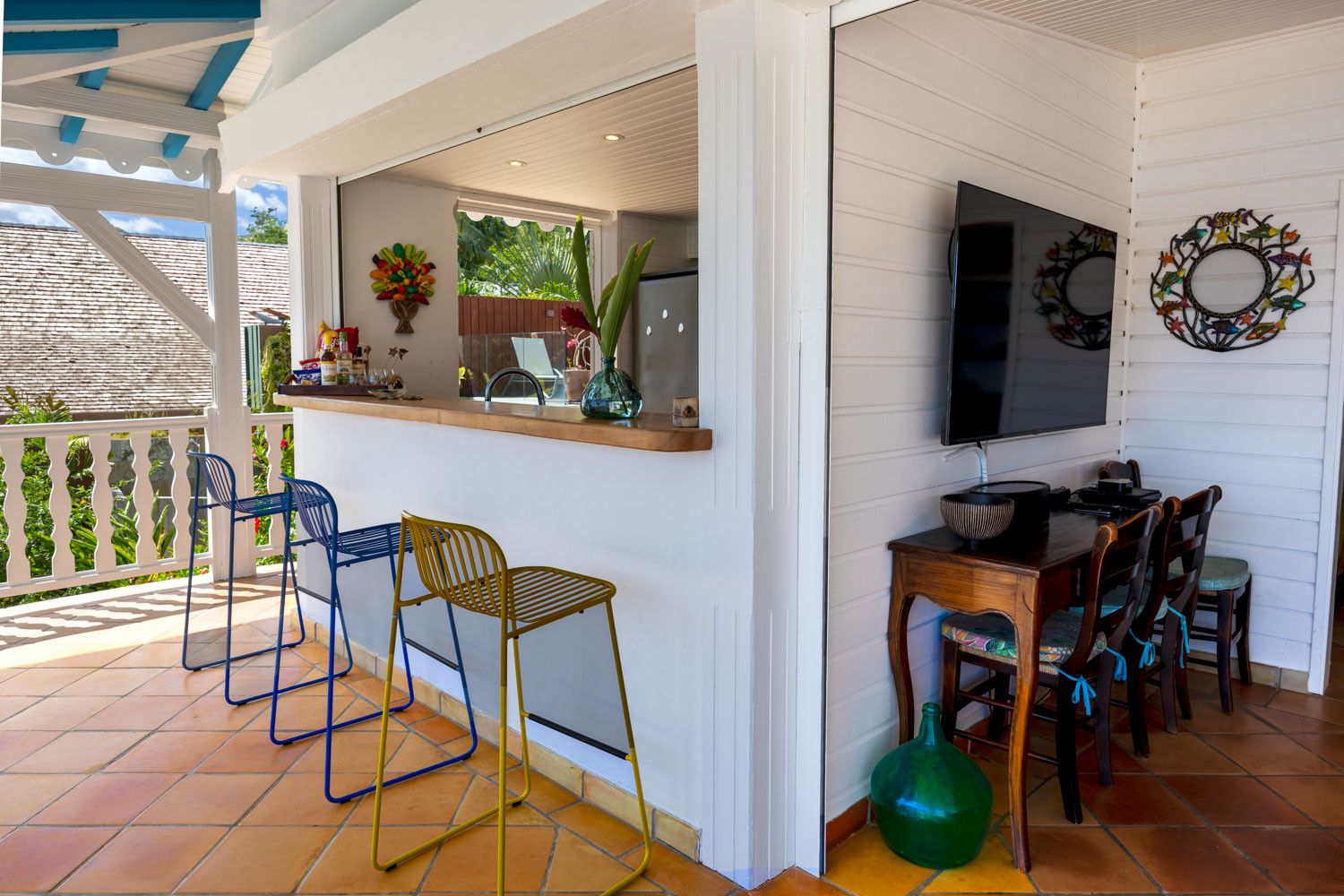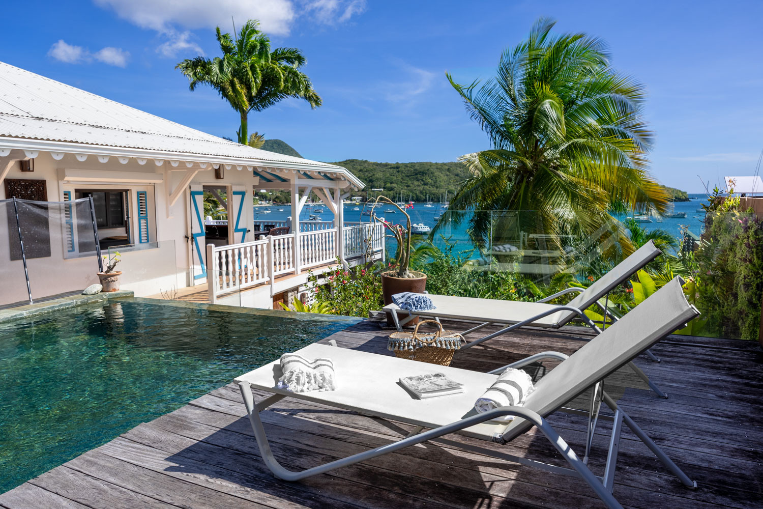 Façade en bois, lambrequins délicatement travaillés, toiture en tôle, jalousies et jardin tropical composent un ensemble au charme affirmé. Face à la villa, la mer des Caraïbes dévoile ses nuances de bleu, ponctuées par les mornes verdoyants et les voiliers au mouillage.