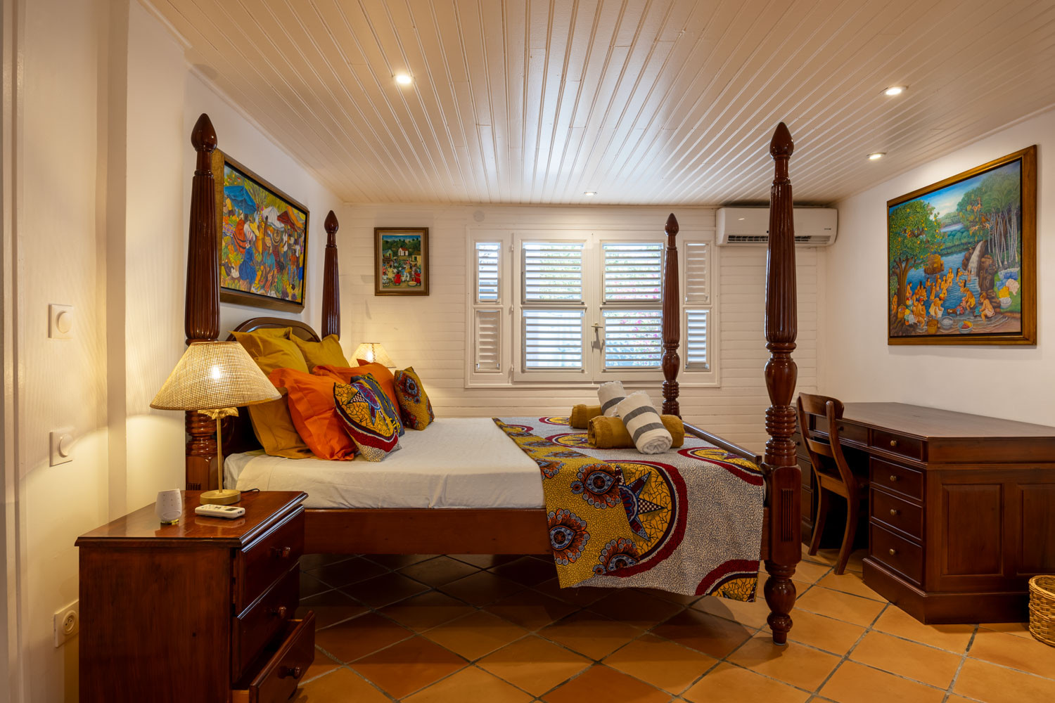 La maison principale dispose de quatre chambres doubles avec salle de douche privative. Deux cottages indépendants complètent l’ensemble, permettant de préserver l’intimité de chacun.